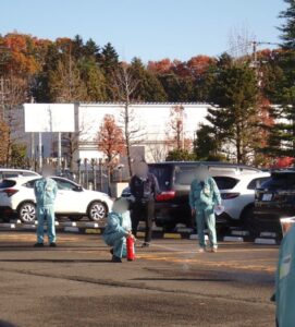 各工場でアナウンスが入り火元に向かい消火班が駆け付けます。